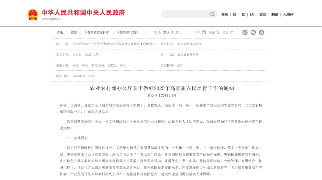 為貫徹落實2025年中央一號文件和2024年中央農村工作會議精神,加強鄉村人才隊伍建設,現就做好2025年高素質農民培育工作通知如下。